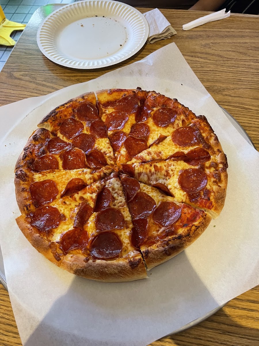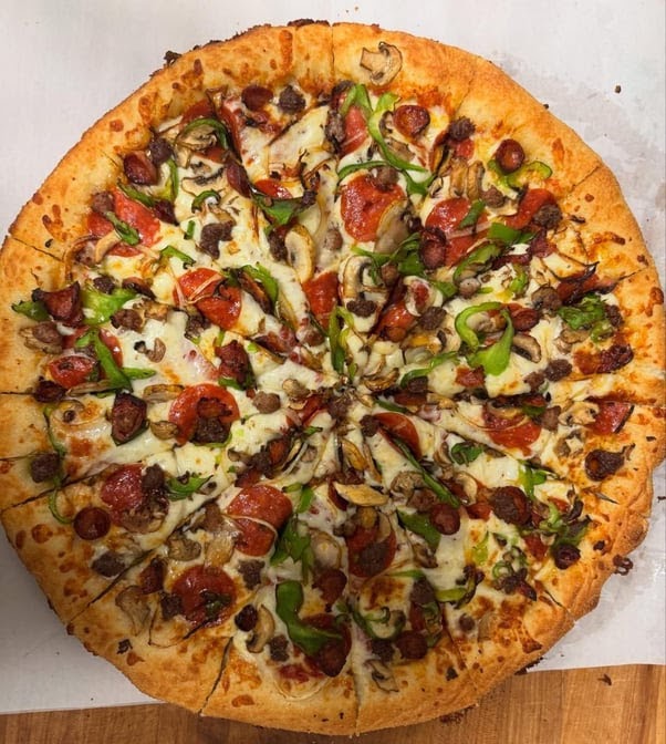 Friendly welcoming staff. Order was made quick and correct. Crust is soft and thick reminds me of a deep dish. Toppings and cheese were plentiful. Ask about the special’s they have going. Don’t hesitate just order already!